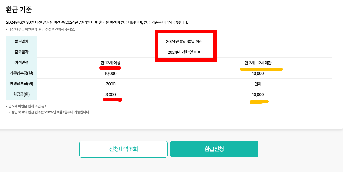 발권일자 2024년 6월 30일 이전 2024년 6월 30일 이전 출국일자 2024년 7월 1일 이후 2024년 7월 1일 이후 기존 납부금 10,000원 10,000원 변경 납부금 7,000원 면제 환급 가능 금액 ✅3,000원 ✅ 10,000원